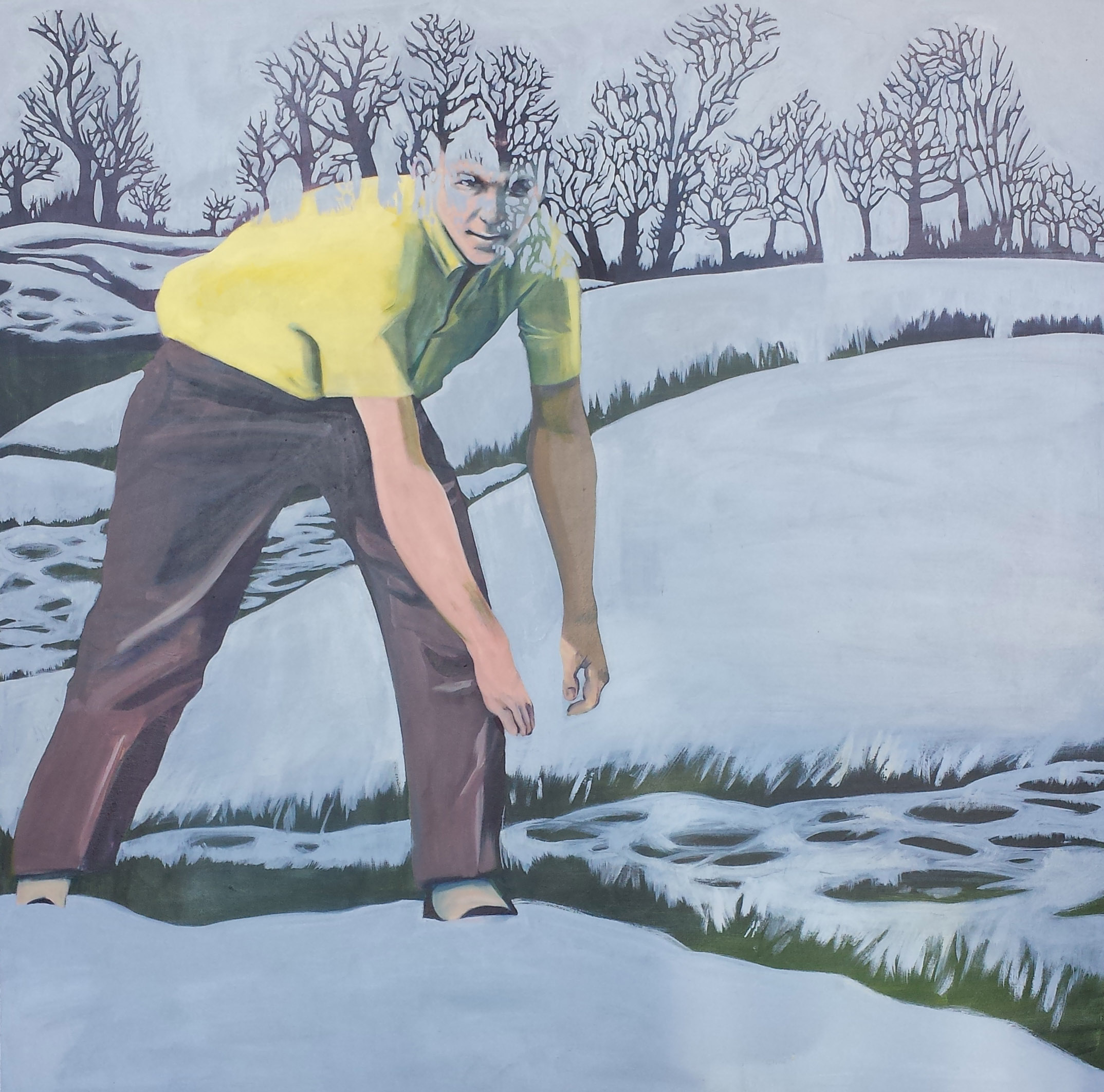 The elements that I have included in these paintings, in addition to the portraits, include background imagery and cartoon animals. Parts of these environments cut across or cover the figure, forcing the figure into and out of the scenery, or making it appear as though one is peering through a reflected scene at the figure. In this way I alienate the human subject from the viewer and take control of the story they tell. In the paintings that include cartoon animals, these flat, cut-out creatures interact benignly or menacingly with the portrait subject, and reshape the meaning of the portraits. Some of these images were displayed in the UNO Fine Arts Gallery as part of the senior exhibition in the spring of 2015.